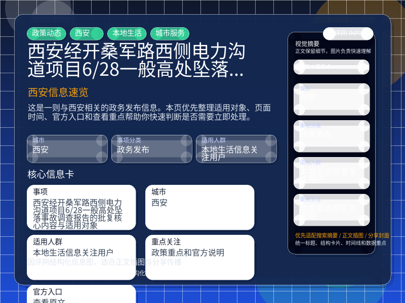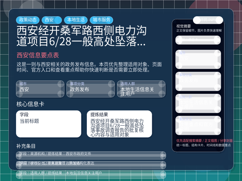 这条信息当前更适合 本地生活信息关注用户 重点关注。如果你正准备处理“西安经开桑军路西侧电力沟道项目6·28一般高处坠落事故调查报告的批复核心内容与适用对象”相关事项,建议先结合自身身份、所属行业或所在区域判断是否属于适用对象。