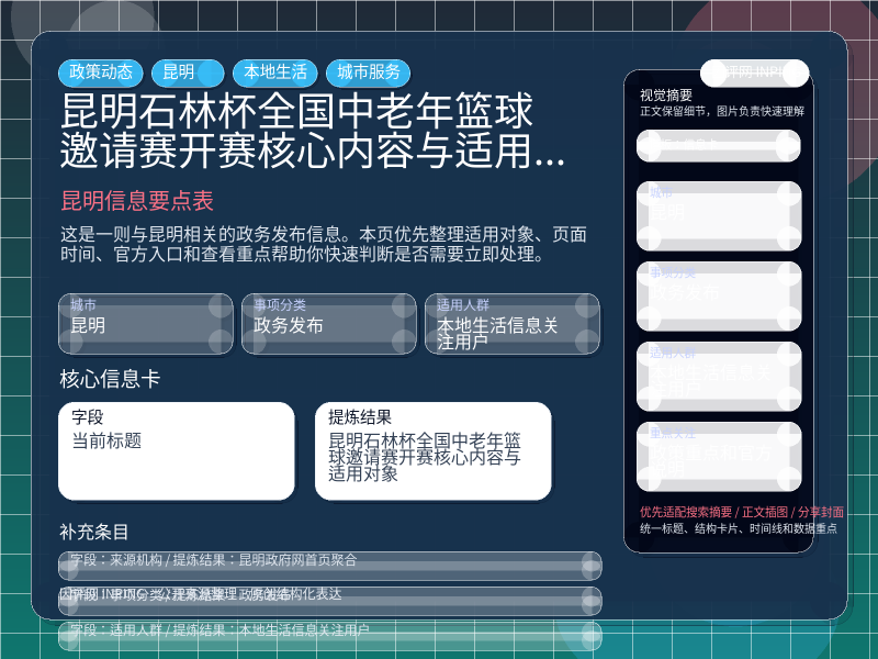 这项信息由 昆明政府网首页聚合 发布,围绕“昆明石林杯全国中老年篮球邀请赛开赛核心内容与适用对象”整理为便于直接查看的本地生活页。进入页面后,先看自己是否属于适用对象,再看政策重点和官方说明。