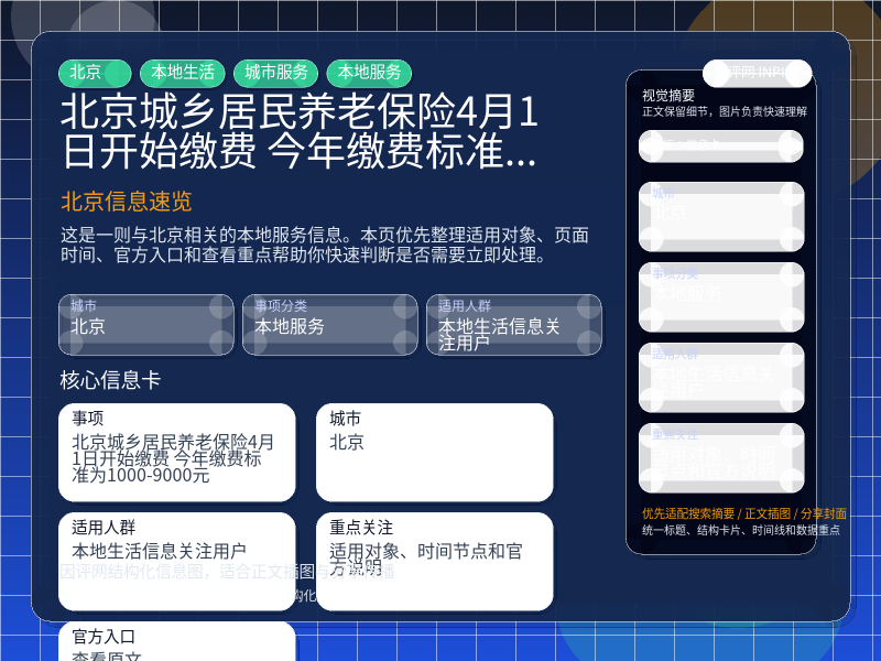 北京本地服务整理,围绕“城乡居民养老保险4月1日开始缴费 今年缴费标准为1000-9000元”提炼为可检索、可阅读的原创结构化内容,优先展示时间、对象、入口和行动建议,来源:北京今日服务提醒。