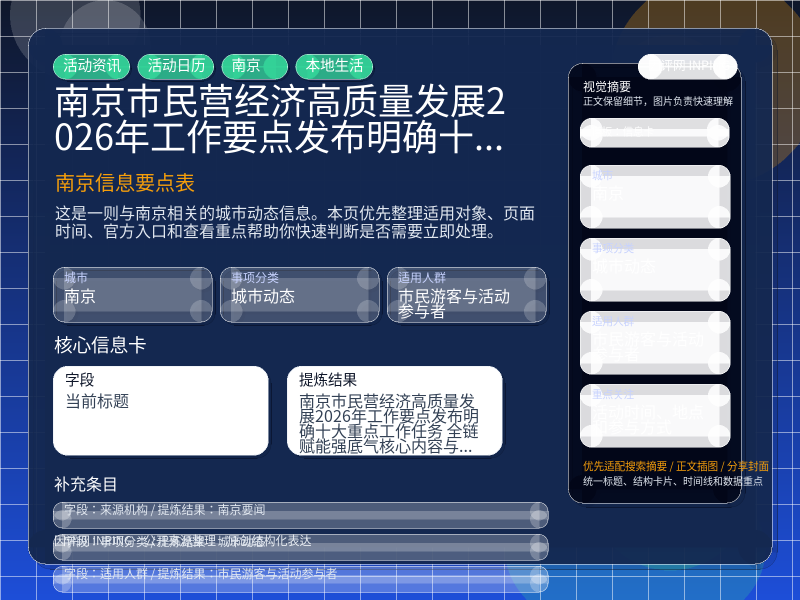 南京城市动态整理,围绕“《南京市民营经济高质量发展2026年工作要点》发布,明确十大重点工作任务 全链赋能强底气,“生力军”奔跑更有力”提炼为可检索、可阅读的原创结构化内容,优先展示时间、对象、入口和行动建议,来源:南京要闻。