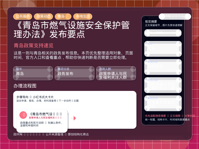 这条信息当前更适合 政策申请人与民生福利关注人群 重点关注。如果你正准备处理“《青岛市燃气设施安全保护管理办法》发布要点”相关事项,建议先结合自身身份、所属行业或所在区域判断是否属于适用对象。