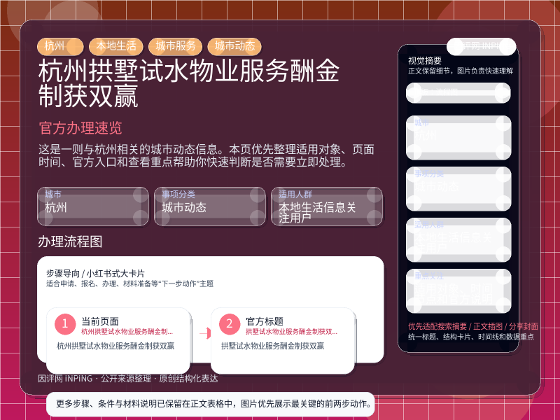 这条信息当前更适合 本地生活信息关注用户 重点关注。如果你正准备处理“杭州拱墅试水物业服务酬金制获双赢”相关事项,建议先结合自身身份、所属行业或所在区域判断是否属于适用对象。