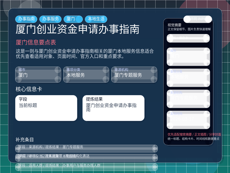 厦门本地服务整理,围绕“创业资金申请”提炼为可检索、可阅读的原创结构化内容,优先展示时间、对象、入口和行动建议,来源:厦门专题服务。