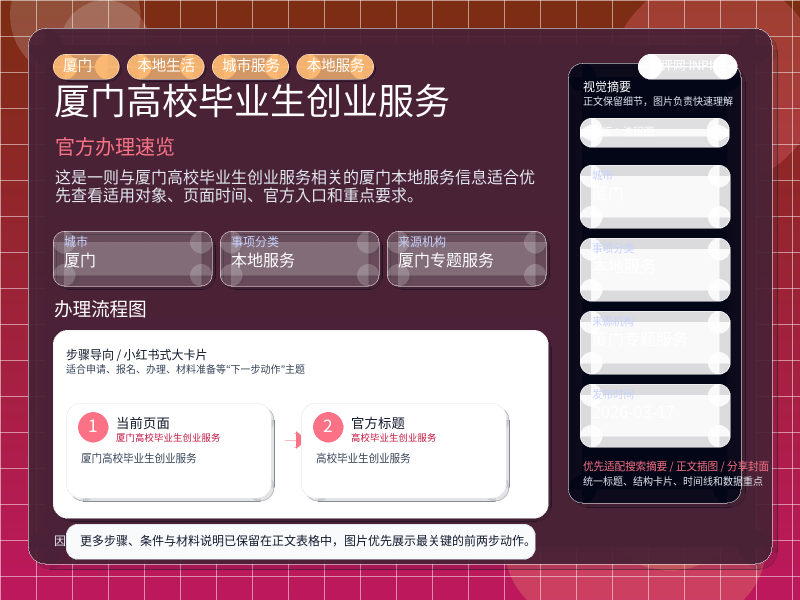 厦门本地服务整理,围绕“高校毕业生创业服务”提炼为可检索、可阅读的原创结构化内容,优先展示时间、对象、入口和行动建议,来源:厦门专题服务。