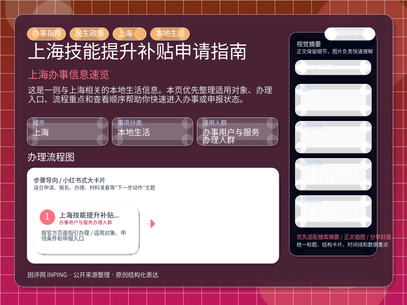 这项信息由 www.inping.com 发布,围绕“上海技能提升补贴申请指南”整理为流程优先的本地生活页。进入页面后,先判断自己是否属于适用对象,再按步骤查看适用对象、申领条件和申报入口。