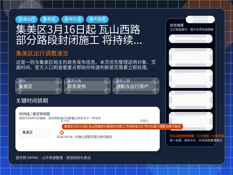 这项信息由 集美区首页聚合 发布,围绕“集美区3月16日起 瓦山西路部分路段封闭施工 将持续至2027年3月通行调整与绕行路线”整理为便于直接查看的本地生活页。进入页面后,先看自己是否属于适用对象,再看通勤安排和限制范围。