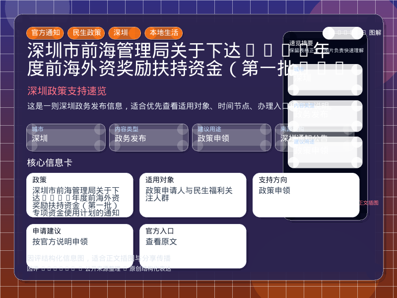 这条信息面向 政务发布 场景,由 深圳通知公告 公开发布,核心主题是“深圳市前海管理局关于下达2025年度前海外资奖励扶持资金(第一批)专项资金使用计划的通知”。因评基于公开元数据做了结构化整理,方便用户快速判断是否与当前需求相关。