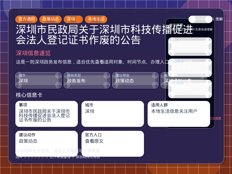 这条信息面向 政务发布 场景,由 深圳通知公告 公开发布,核心主题是“深圳市民政局关于深圳市科技传播促进会法人登记证书作废的公告”。因评基于公开元数据做了结构化整理,方便用户快速判断是否与当前需求相关。