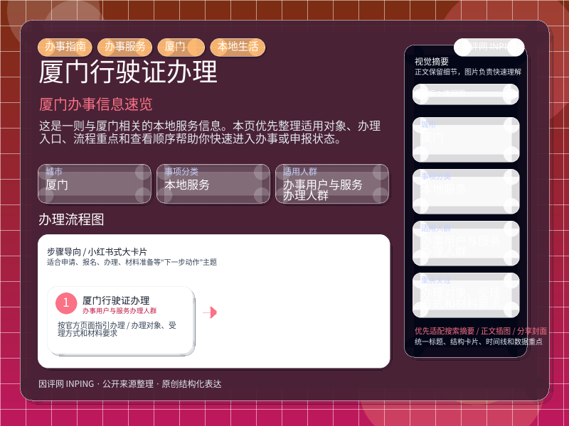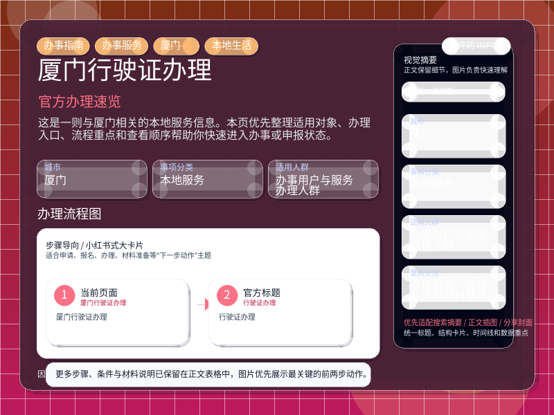 厦门本地服务整理,围绕“行驶证办理”提炼为可检索、可阅读的原创结构化内容,优先展示时间、对象、入口和行动建议,来源:厦门专题服务。