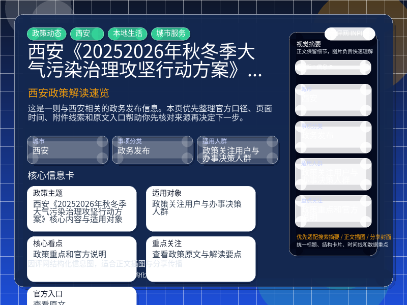 西安政务发布整理,围绕“西安市人民政府办公厅关于印发2025—2026年秋冬季大气污染治理攻坚行动方案的通知”提炼为可检索、可阅读的原创结构化内容,优先展示时间、对象、入口和行动建议,来源:西安市政府办公厅文件。