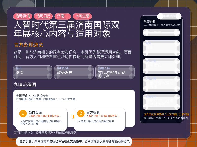 这项信息由 济南政府网首页聚合 发布,围绕“人智时代——第三届济南国际双年展核心内容与适用对象”整理为便于直接查看的本地生活页。进入页面后,先看自己是否属于适用对象,再看活动时间、地点和参与方式。