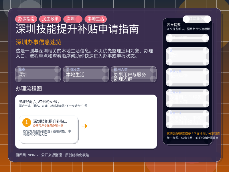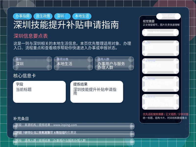 这项信息由 www.inping.com 发布,围绕“深圳技能提升补贴申请指南”整理为流程优先的本地生活页。进入页面后,先判断自己是否属于适用对象,再按步骤查看适用对象、申领条件和申报入口。