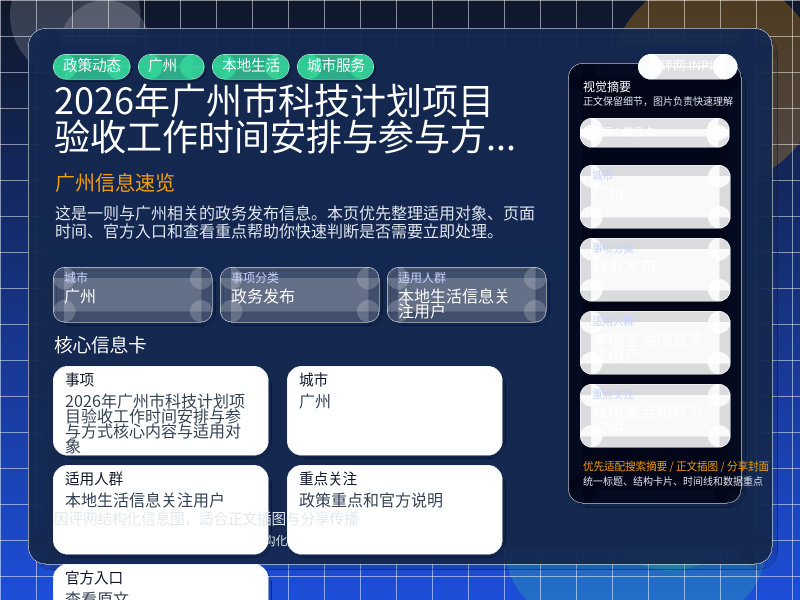 这条信息当前更适合 本地生活信息关注用户 重点关注。如果你正准备处理“2026年广州市科技计划项目验收工作时间安排与参与方式核心内容与适用对象”相关事项,建议先结合自身身份、所属行业或所在区域判断是否属于适用对象。