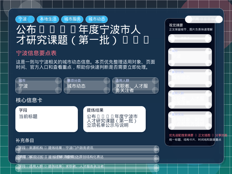 宁波城市动态整理,围绕“关于公布2026年度宁波市人才研究课题(第一批)立项名单的通知”提炼为可检索、可阅读的原创结构化内容,优先展示时间、对象、入口和行动建议,来源:宁波门户政务资讯。