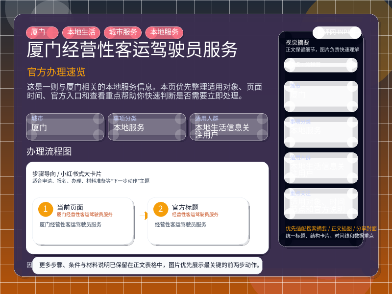 厦门本地服务整理,围绕“经营性客运驾驶员服务”提炼为可检索、可阅读的原创结构化内容,优先展示时间、对象、入口和行动建议,来源:厦门专题服务。