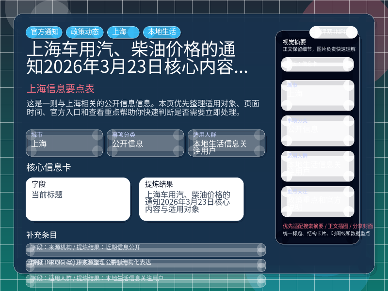 上海公开信息整理,围绕“上海市发展和改革委员会关于车用汽、柴油价格的通知(2026年3月23日)”提炼为可检索、可阅读的原创结构化内容,优先展示时间、对象、入口和行动建议,来源:近期信息公开。