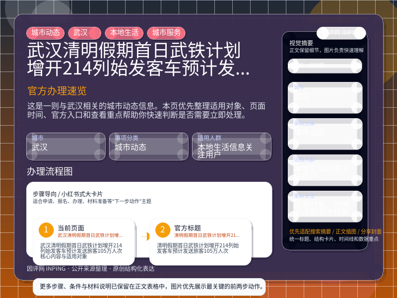 武汉城市动态整理,围绕“清明假期首日,武铁计划增开214列始发客车,预计发送旅客105万人次”提炼为可检索、可阅读的原创结构化内容,优先展示时间、对象、入口和行动建议,来源:武汉动态。