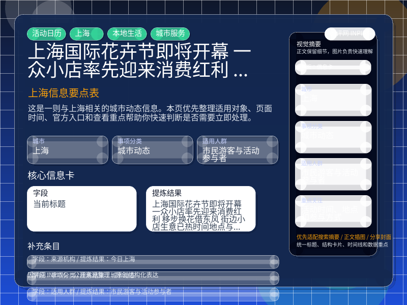 上海城市动态整理,围绕“上海国际花卉节即将开幕 一众小店率先迎来消费红利 移步换花借东风 街边小店生意已热”提炼为可检索、可阅读的原创结构化内容,优先展示时间、对象、入口和行动建议,来源:今日上海。