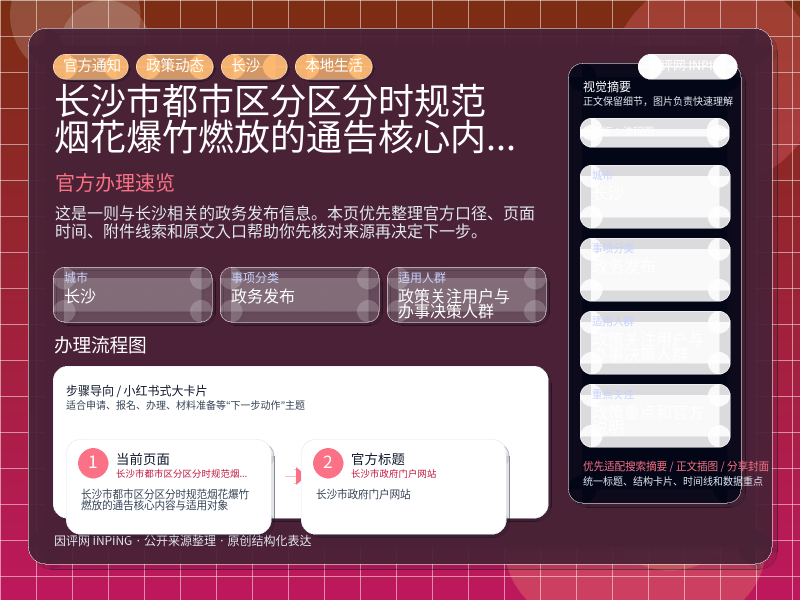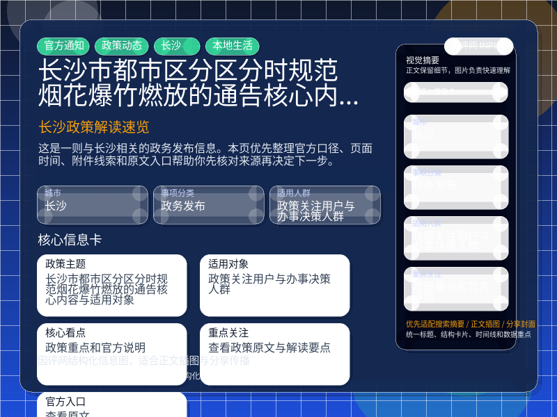 长沙政务发布整理,围绕“《关于长沙市都市区分区分时规范烟花爆竹燃放的通告》政策解读”提炼为可检索、可阅读的原创结构化内容,优先展示时间、对象、入口和行动建议,来源:长沙政策解读。