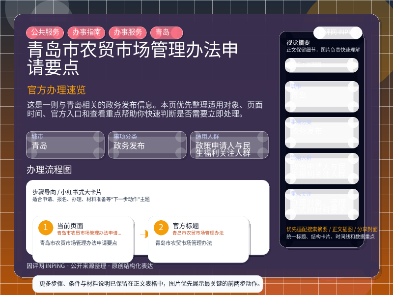 青岛政务发布整理,围绕“青岛市农贸市场管理办法”提炼为可检索、可阅读的原创结构化内容,优先展示时间、对象、入口和行动建议,来源:青岛政务公开。
