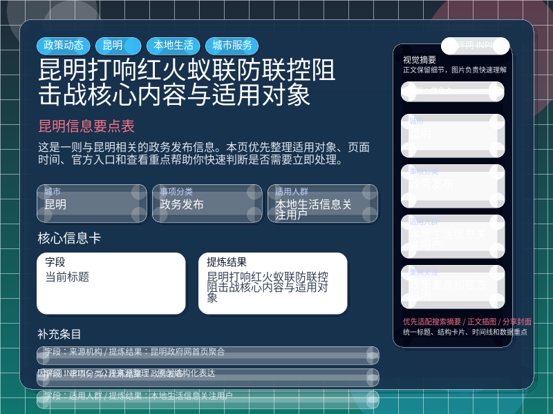 这项信息由 昆明政府网首页聚合 发布,围绕“昆明打响红火蚁联防联控阻击战核心内容与适用对象”整理为便于直接查看的本地生活页。进入页面后,先看自己是否属于适用对象,再看政策重点和官方说明。