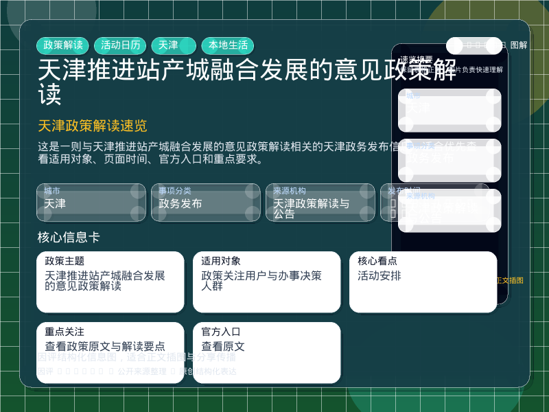 这项信息由 天津政策解读与公告 发布,主要帮助你快速确认“天津推进站产城融合发展的意见政策解读”是否与自己有关,以及适用对象、执行时间和官方说明。