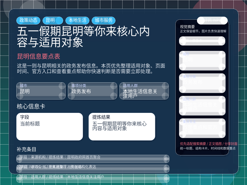 | 五一假期昆明等你来核心内容与适用对象 | 昆明 | 本地生活信息关注用户 | 政策重点和官方说明 | 查看原文 |