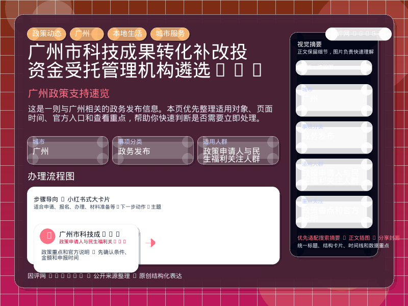 这条信息当前更适合 政策申请人与民生福利关注人群 重点关注。如果你正准备处理“广州市科技成果转化“补改投”资金受托管理机构遴选申报与参与指南”相关事项,建议先结合自身身份、所属行业或所在区域判断是否属于适用对象。