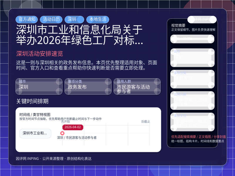 深圳政务发布整理,围绕“市工业和信息化局关于举办2026年绿色工厂对标培育专题活动的通知”提炼为可检索、可阅读的原创结构化内容,优先展示时间、对象、入口和行动建议,来源:深圳通知公告。
