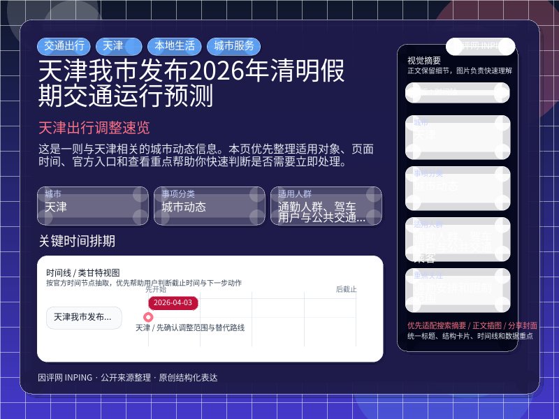这项信息由 天津门户焦点与动态 发布,围绕“天津我市发布2026年清明假期交通运行预测”整理为便于直接查看的本地生活页。进入页面后,先看自己是否属于适用对象,再看通勤安排和限制范围。