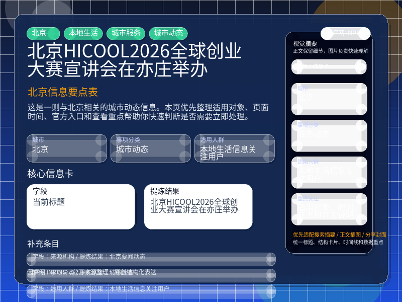 北京城市动态整理,围绕“HICOOL2026全球创业大赛宣讲会在亦庄举办”提炼为可检索、可阅读的原创结构化内容,优先展示时间、对象、入口和行动建议,来源:北京要闻动态。