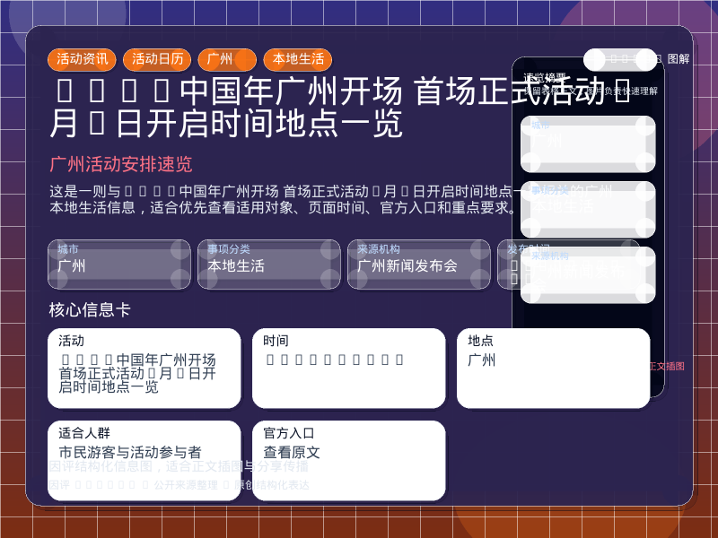 广州本地生活整理,围绕“APEC“中国年”广州开场 首场正式活动2月1日开启”提炼为可检索、可阅读的原创结构化内容,优先展示时间、对象、入口和行动建议,来源:广州新闻发布会。