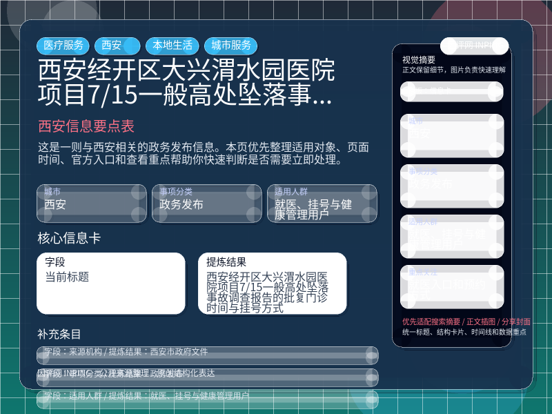 这条信息当前更适合 就医、挂号与健康管理用户 重点关注。如果你正准备处理“西安经开区大兴渭水园医院项目7·15一般高处坠落事故调查报告的批复门诊时间与挂号方式”相关事项,建议先结合自身身份、所属行业或所在区域判断是否属于适用对象。