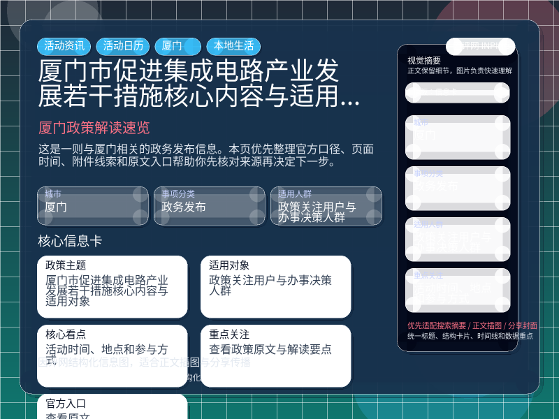 这项信息由 厦门政策解读 发布,围绕“厦门市促进集成电路产业发展若干措施核心内容与适用对象”整理为官方口径优先的本地生活页。进入页面后,先核对原文入口、页面时间和附件,再看活动时间、地点和参与方式。