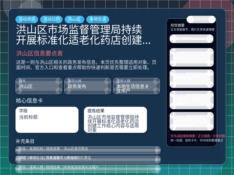 这条信息当前更适合 本地生活信息关注用户 重点关注。如果你正准备处理“洪山区市场监督管理局持续开展标准化适老化药店创建工作核心内容与适用对象”相关事项,建议先结合自身身份、所属行业或所在区域判断是否属于适用对象。