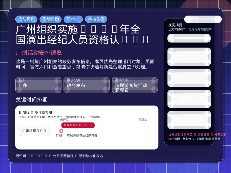 这项信息由 广州通知公告 发布,围绕“广州组织实施2026年全国演出经纪人员资格认定考试时间安排与报名指南”整理为便于直接查看的本地生活页。进入页面后,先看自己是否属于适用对象,再看活动时间、地点和参与方式。