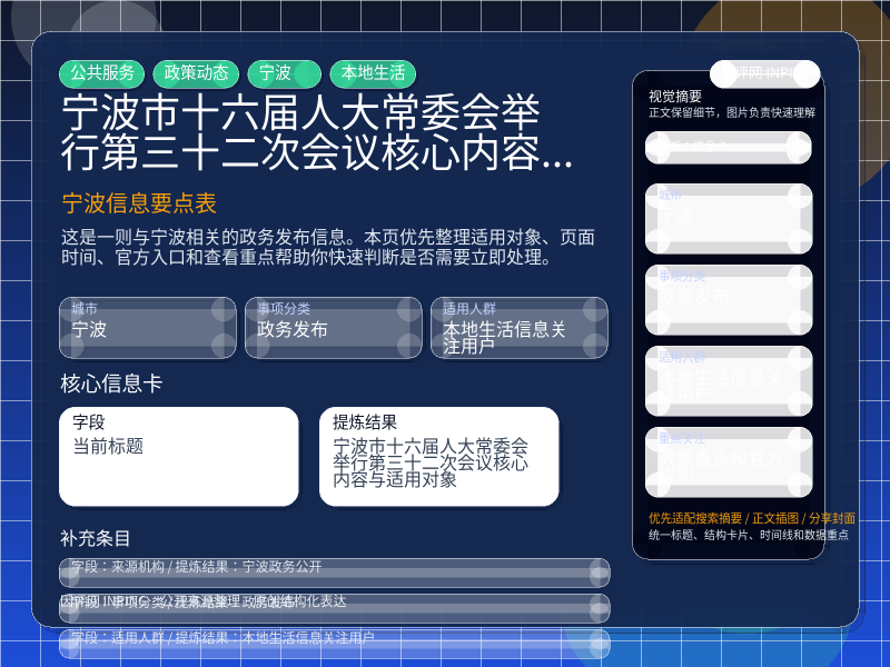 这项信息由 宁波政务公开 发布,围绕“宁波市十六届人大常委会举行第三十二次会议核心内容与适用对象”整理为便于直接查看的本地生活页。进入页面后,先看自己是否属于适用对象,再看政策重点和官方说明。