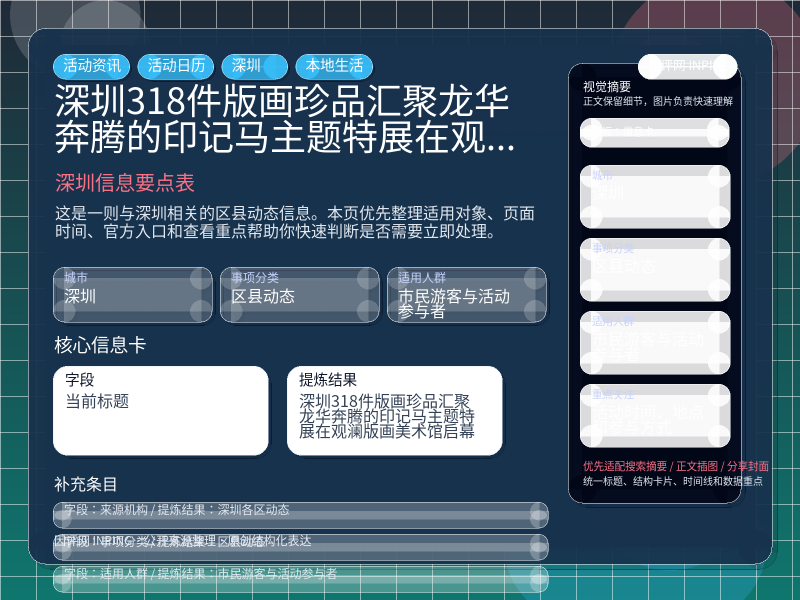 这项信息由 深圳各区动态 发布,围绕“深圳318件版画珍品汇聚龙华,奔腾的印记马主题特展在观澜版画美术馆启幕”整理为便于直接查看的本地生活页。进入页面后,先看自己是否属于适用对象,再看活动时间、地点和参与方式。