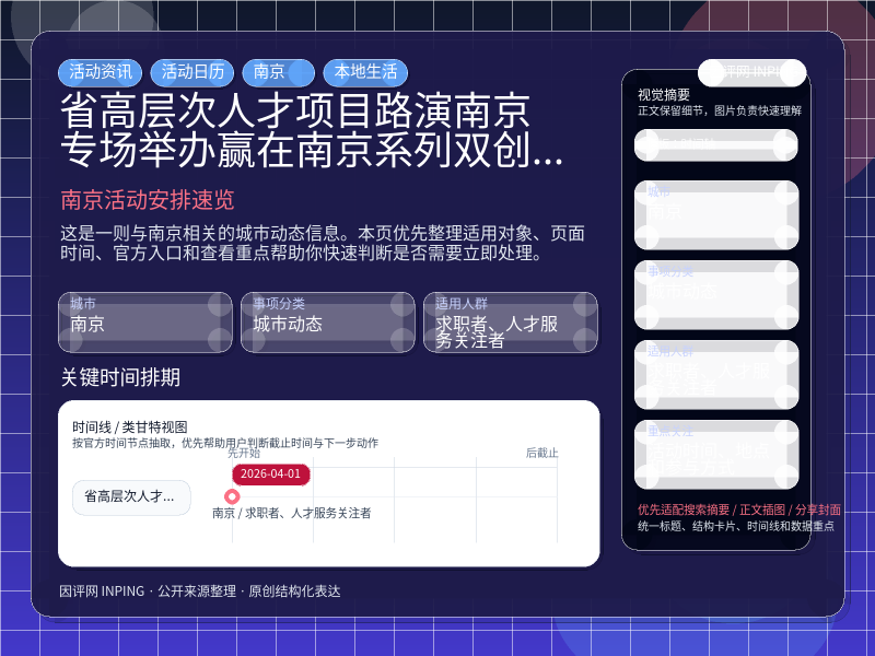 南京城市动态整理,围绕“省高层次人才项目路演(南京专场)举办,“赢在南京”系列双创赛事、“创在南京”系列项目路演启动 深爱人才的南京,是逐梦的热土”提炼为可检索、可阅读的原创结构化内容,优先展示时间、对象、入口和行动建议,来源:南京要闻。