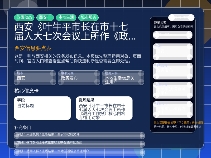 这条信息当前更适合 本地生活信息关注用户 重点关注。如果你正准备处理“西安《叶牛平市长在市十七届人大七次会议上所作《政府工作报》核心内容与适用对象”相关事项,建议先结合自身身份、所属行业或所在区域判断是否属于适用对象。