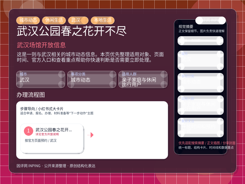武汉城市动态整理,围绕“武汉公园“春之花开不尽””提炼为可检索、可阅读的原创结构化内容,优先展示时间、对象、入口和行动建议,来源:武汉动态。