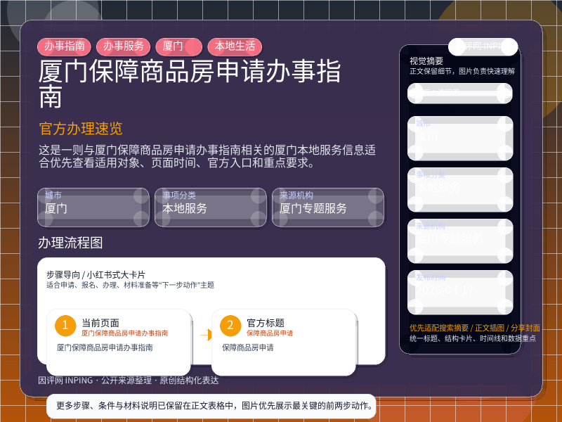 厦门本地服务整理,围绕“保障商品房申请”提炼为可检索、可阅读的原创结构化内容,优先展示时间、对象、入口和行动建议,来源:厦门专题服务。