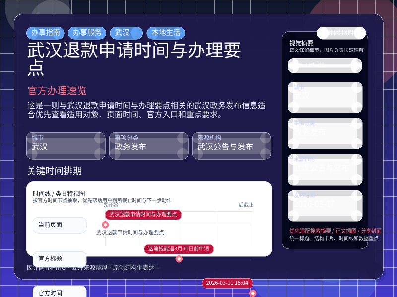 武汉政务发布整理,围绕“这笔钱能退!3月31日前申请”提炼为可检索、可阅读的原创结构化内容,优先展示时间、对象、入口和行动建议,来源:武汉公告与发布。