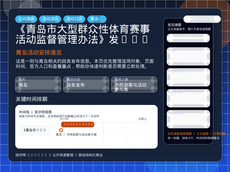 青岛政务发布整理,围绕“青岛市人民政府办公厅关于印发青岛市大型群众性体育赛事活动监督管理办法的通知”提炼为可检索、可阅读的原创结构化内容,优先展示时间、对象、入口和行动建议,来源:青岛政务公开。