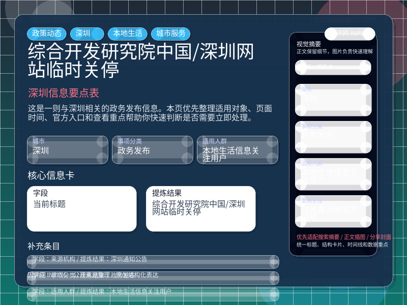 深圳政务发布整理,围绕“关于综合开发研究院(中国·深圳)网站临时关停的公告”提炼为可检索、可阅读的原创结构化内容,优先展示时间、对象、入口和行动建议,来源:深圳通知公告。