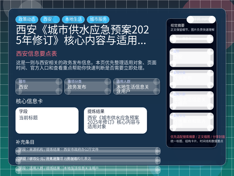 这条信息当前更适合 本地生活信息关注用户 重点关注。如果你正准备处理“西安《城市供水应急预案(2025年修订)》核心内容与适用对象”相关事项,建议先结合自身身份、所属行业或所在区域判断是否属于适用对象。