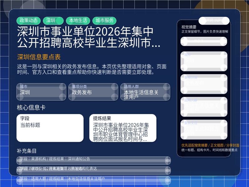 深圳政务发布整理,围绕“深圳市事业单位2026年集中公开招聘高校毕业生深圳市职业体育管理中心招聘岗位面试公告”提炼为可检索、可阅读的原创结构化内容,优先展示时间、对象、入口和行动建议,来源:深圳通知公告。