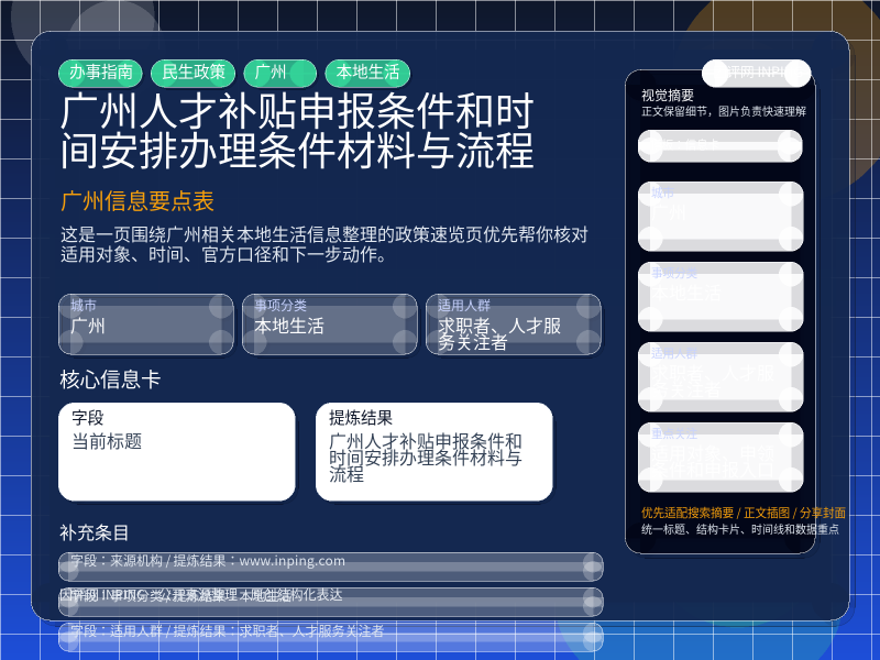 这项信息由 www.inping.com 发布,围绕“广州人才补贴申报条件和时间安排办理条件材料与流程”整理为政策速览页。进入页面后,先核对适用对象、时间和官方口径,再看适用对象、申领条件和申报入口。