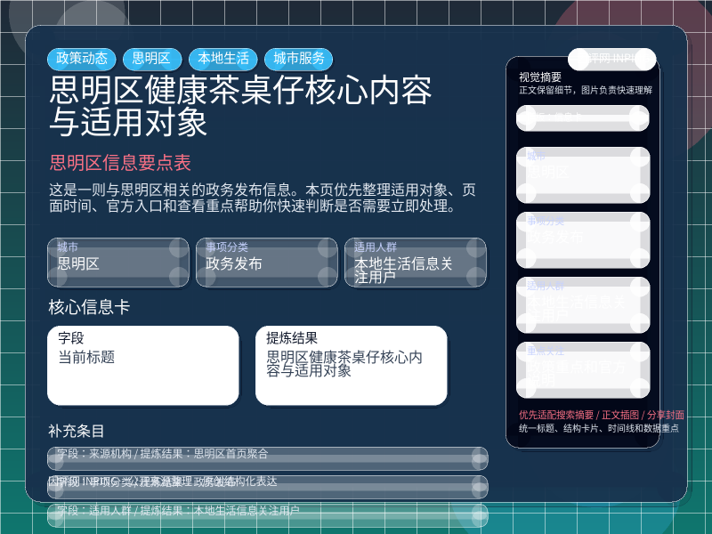 这项信息由 思明区首页聚合 发布,围绕“思明区健康茶桌仔核心内容与适用对象”整理为便于直接查看的本地生活页。进入页面后,先看自己是否属于适用对象,再看政策重点和官方说明。