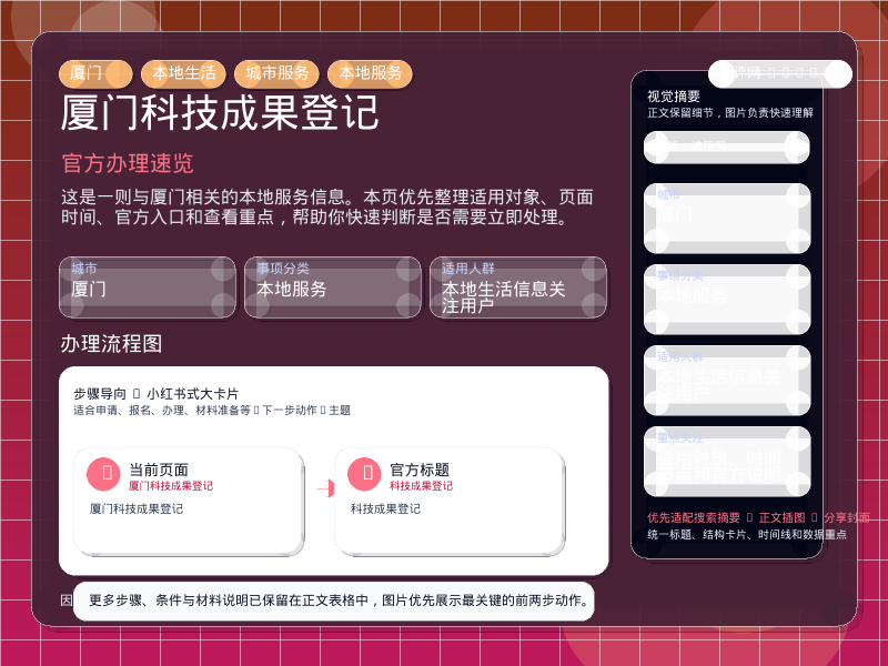 厦门本地服务整理,围绕“科技成果登记”提炼为可检索、可阅读的原创结构化内容,优先展示时间、对象、入口和行动建议,来源:厦门专题服务。